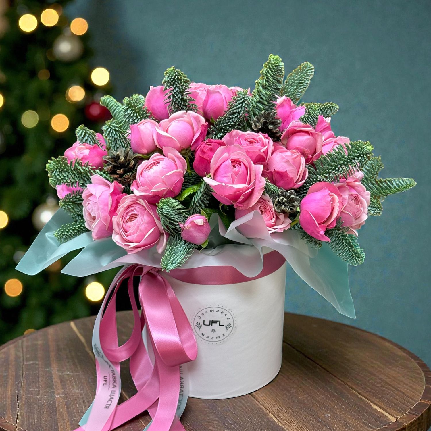 Inspired by delicate shades of pink and winter magic, this composition is designed to give an atmosphere of warmth and beauty. Pink peony roses combined with fragrant fir branches create harmony and sophistication that reminds of a fabulous winter night.